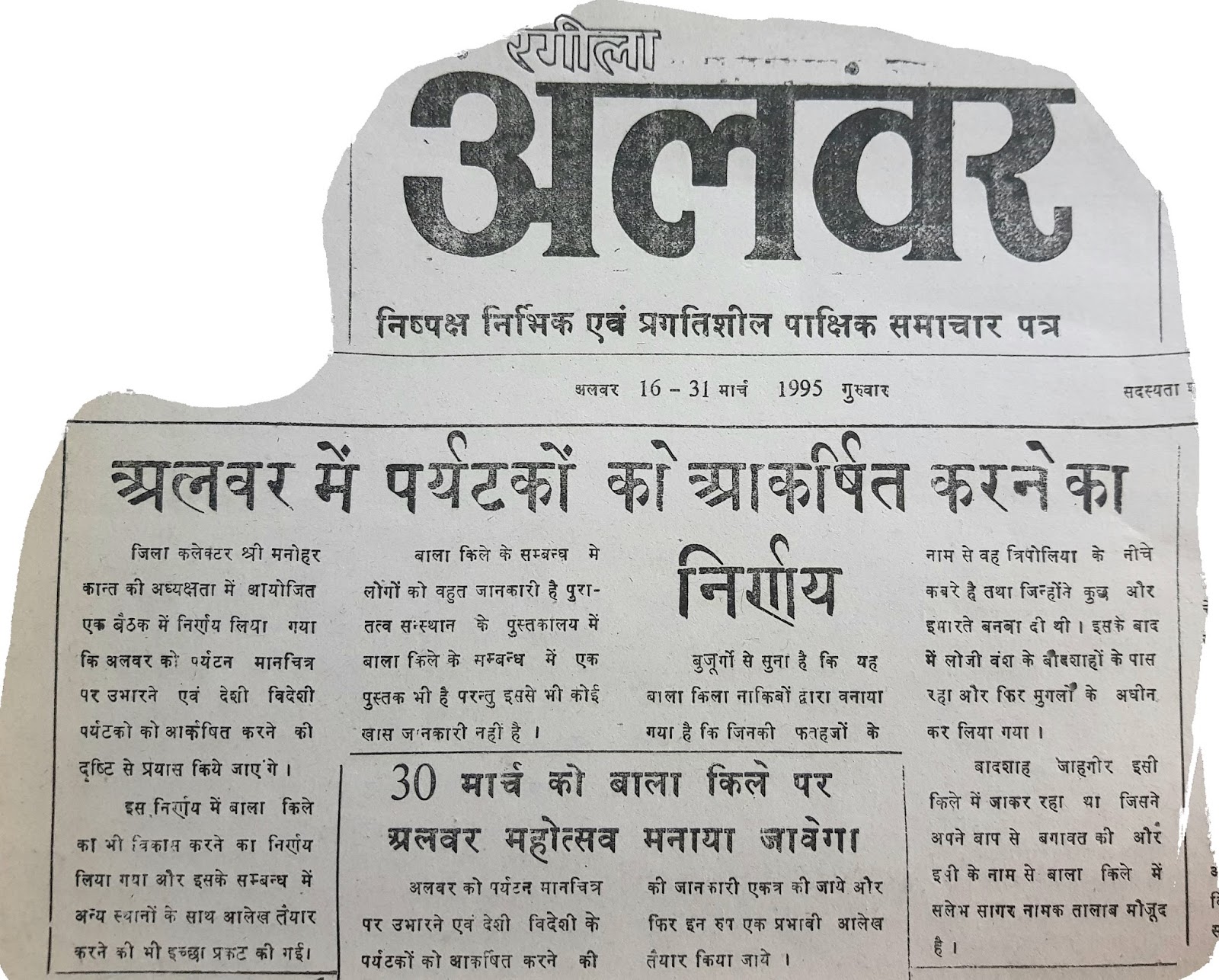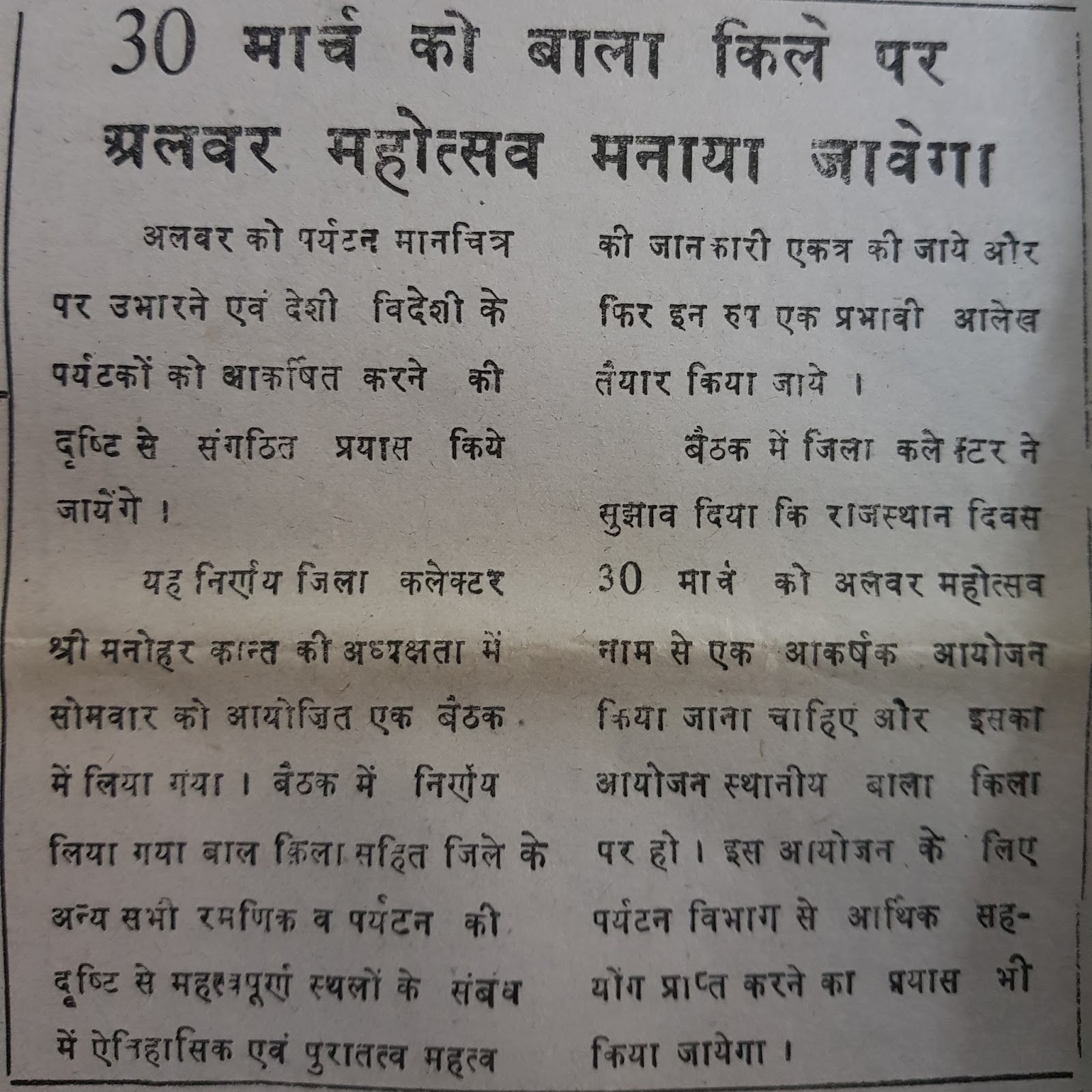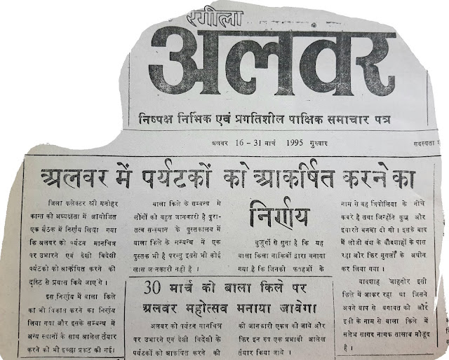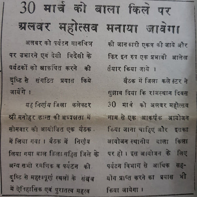 अलवर उत्सव भी 30 मार्च को ही करने का फैसला अधिकारियों की एक बैठक में किया गया था जिसमें अलवर उत्सव के नाम से एक आकर्षक आयोजन तय किया गया। पर्यटन विभाग को भी शामिल करने समेत कई फैसले हुए और विभिन्न विभागों को जिम्मेदारी दी गई। वक्त के साथ तारीख और समय बदलता गया। फरवरी माह में भी अलवर उत्सव का आयोजन हुआ या यूँ कहें कि प्रशासन अपनी मर्जी से उस आयोजन को करने लगा। लेकिन सबसे बड़ी बात ये कि शहर में एक अच्छी परम्परा की नींव पड़ गई थी। ये अखबार मार्च 1995 का है जिसके बाद पैदा होने वाले लड़कों की शादी की उम्र हो गई है।  खास उन्हीं के लिए अखबार की कतरन निकाली गई है। जो मोबाइल के जमाने में  आ गये, जन्म के समय का अखबार ऐसा होता था।