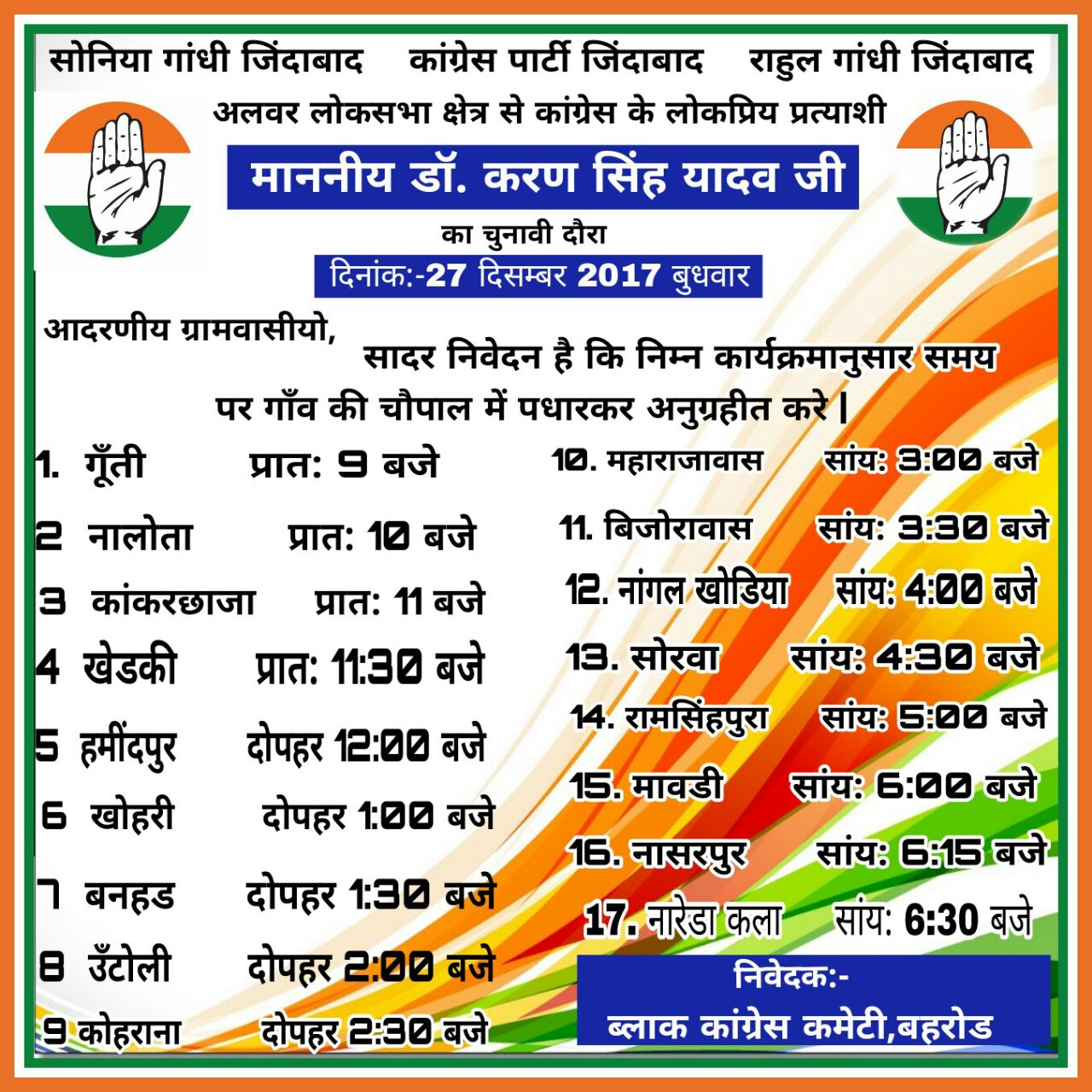 23 दिसम्बर को दिल्ली के 15 रकाबगंज पर आयोजित बैठक में डा. करणसिंह यादव के नाम पर मुहर लग गई थी। देर शाम तक खुद कांग्रेस ने बयान जारी कर अपने प्रत्याशी की घोषणा कर दी थी लेकिन 6 दिन बीत जाने के बाद भी कांग्रेस वहीं है जहां 23 दिसम्बर को थी। खुद भाजपा को इसका डर लग रहा था कि कांग्रेस प्रत्याशी के नाम का माइलेज ना ले ले। लेकिन कांग्रेस की गुटबाजी और कुप्रबन्धन भाजपा के लिए लाभदायक है।