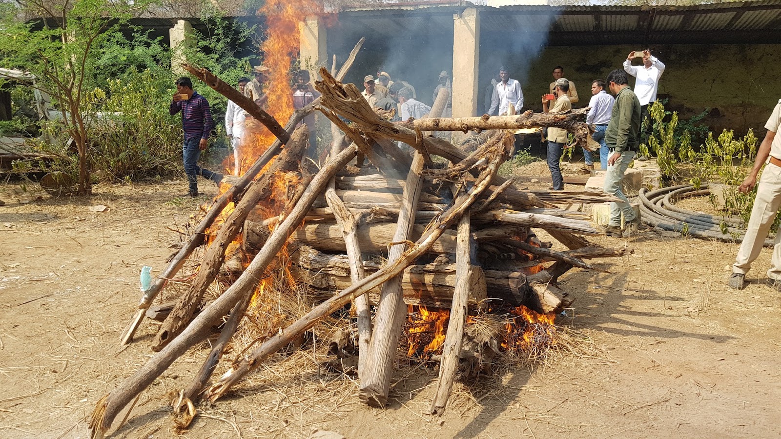 | पोस्टमार्टम के दौरान बाघ को धोक लगाती एक ग्रामीण महिला |